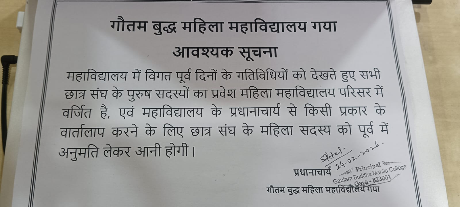 In view of recent developments, it is hereby informed that entry of male members of any student organization is prohibited within the premises of Gautam Buddha Mahila Mahavidyalaya, Gaya.